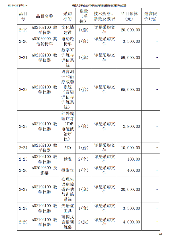 呼伦贝尔职业技术学院设备采购项目询价公告